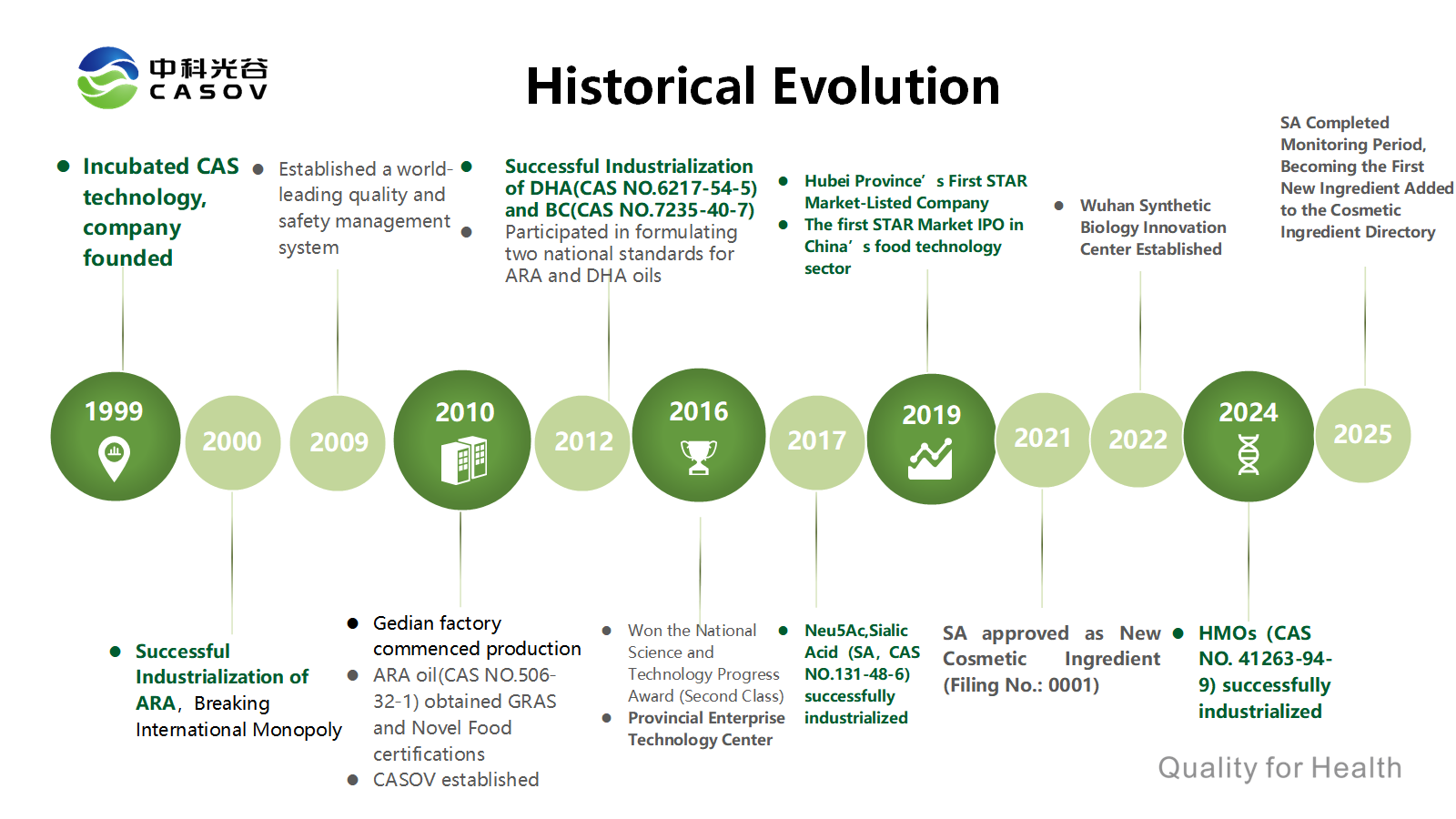 Компания Wuhan CASOV Green Biotech Co., Ltd., являющаяся дочерней компанией, полностью принадлежащей зарегистрированной на бирже STAR Market группе CABIO Group (код акции: 688089), использует технологические ресурсы Китайской академии наук и современную систему исследований и разработок для сосредоточения внимания на биоферментации, разработке функциональных ингредиентов и их применении. Признанная «Национальным высокотехнологичным предприятием» в октябре 2014 года, компания функционирует как Хубэйский провинциальный центр биотехнологических инноваций и биоинженерный центр, а также является управляющей организацией Центра биологической селекции Китайской академии наук, поддерживая тесное сотрудничество с ведущими научными группами Хэфэйских институтов физических наук Китайской академии наук для обеспечения непрерывных технологических инноваций.